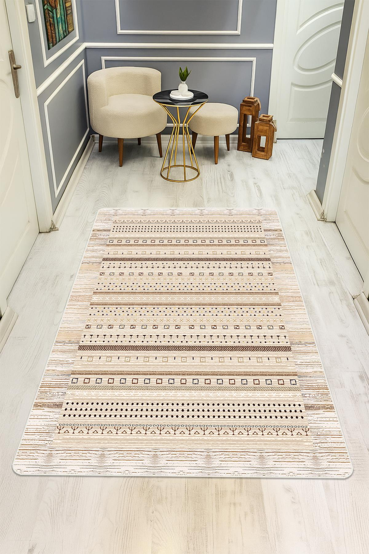 Etnik Krem Desenli Süngerli Kaymaz Dot Taban Dijital Baskı Halı H1069