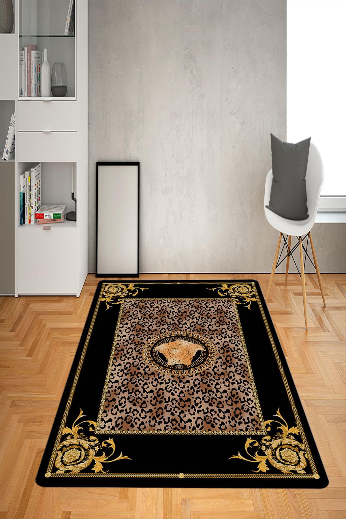 Kaymaz Taban Yıkanabilir Gold Baroque Leopar Medusa Desenli Dot Taban Halı